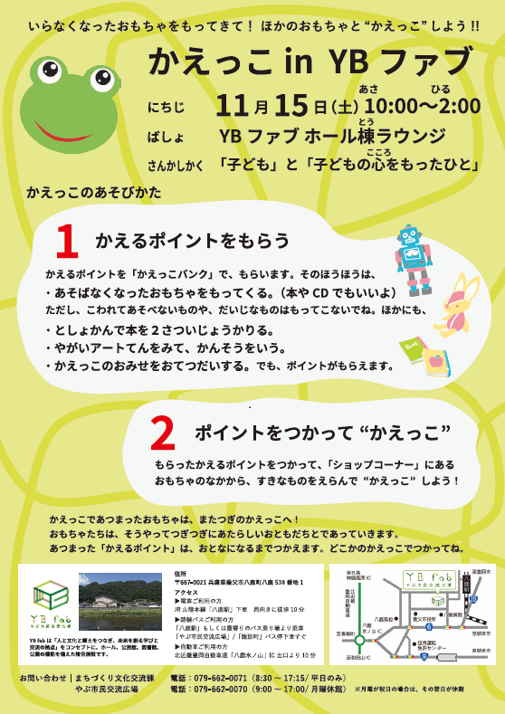 11月15日(土曜日)、やぶ市民交流広場ホール棟ラウンジで「かえっこ in YBファブ」を開催し、55名が参加しました。