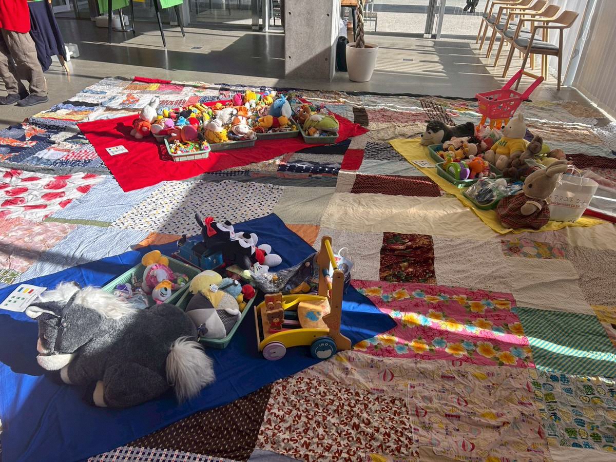 このイベントは「いらなくなったおもちゃを持ってきて、他のおもちゃと”かえっこ”する」というもので、使わなくなったおもちゃの他、アート展の感想や、図書館の貸出レシートで”かえるポイント”をもらい、親子で会話しながら気に入ったおもちゃと”かえっこ”していました。