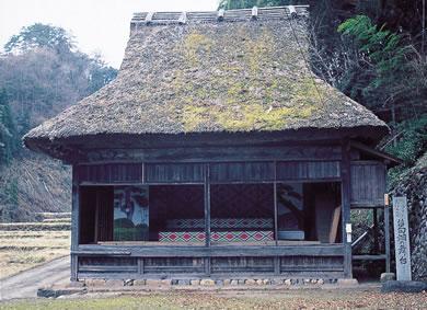 天文13年(1544)に荒御霊神社境内に建てられた舞台を、本格的な歌舞伎舞台にするため、明治25年に改修された芝居堂です。 民家型入母屋造りの茅葺きとなっており、地下で舞台を回す独楽廻式で、背景を天井から上げ下げする「ブドウ棚」、背景移動装置「田楽がえし」など、農村歌舞伎舞台で大切な7つの機構をすべて備えています。 国指定重要有形民俗文化財に指定されています。